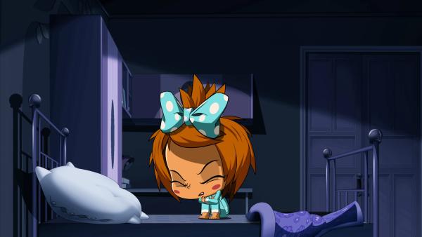 Sima sitzt mit ihren Puppen auf dem Bett.